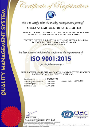 We also have a state-of-the-art Codemat Inspection System, to detect and prevent mix-up of cartons online. The camera reads the pharmacode, which is printed by us, on the gluing flap of the carton. If another carton enters the folder gluer, the camera automatically senses a mix-up and immediately stops the machine. This prevents any carton mix-up, as well as missing printed text/colour as well.